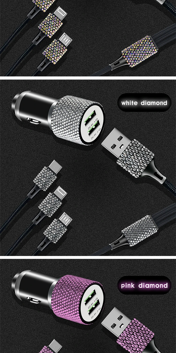 Lilanglam 3 in 1 Car Charger 5V 2.4A Diamond Fast Charging Cable for iPhone Android Type-C Phone Car Bling Accessories For Woman